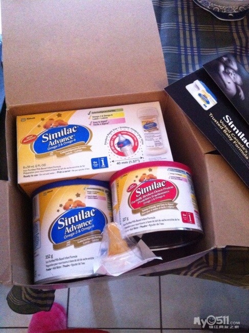 大约7月份网上注册similac的club,很快收到他们第一份试用装,雅培孕妇奶,随着宝宝due date临近,上礼拜收到了一箱宝宝奶的试用装蛮实惠的一箱,包括一箱(6-8瓶)水奶,加一个乳胶奶嘴,两罐一段的奶粉还有一些coupon,加上10刀的返现金支票虽然还没派上用场,但心里着实满足呀