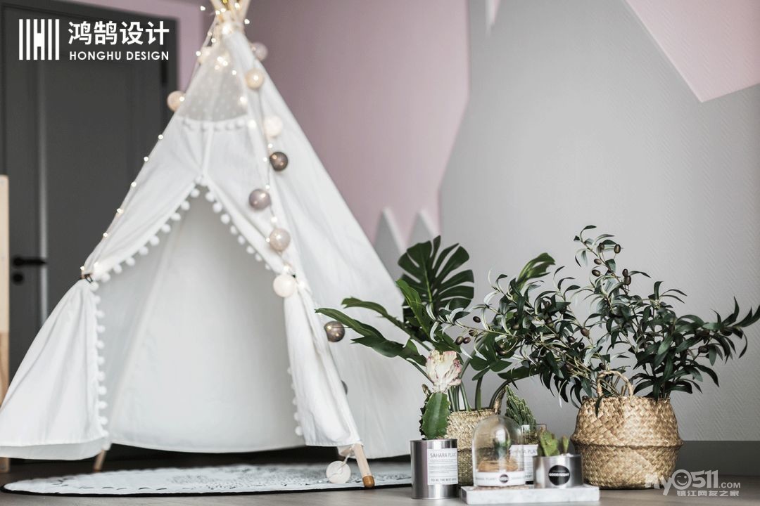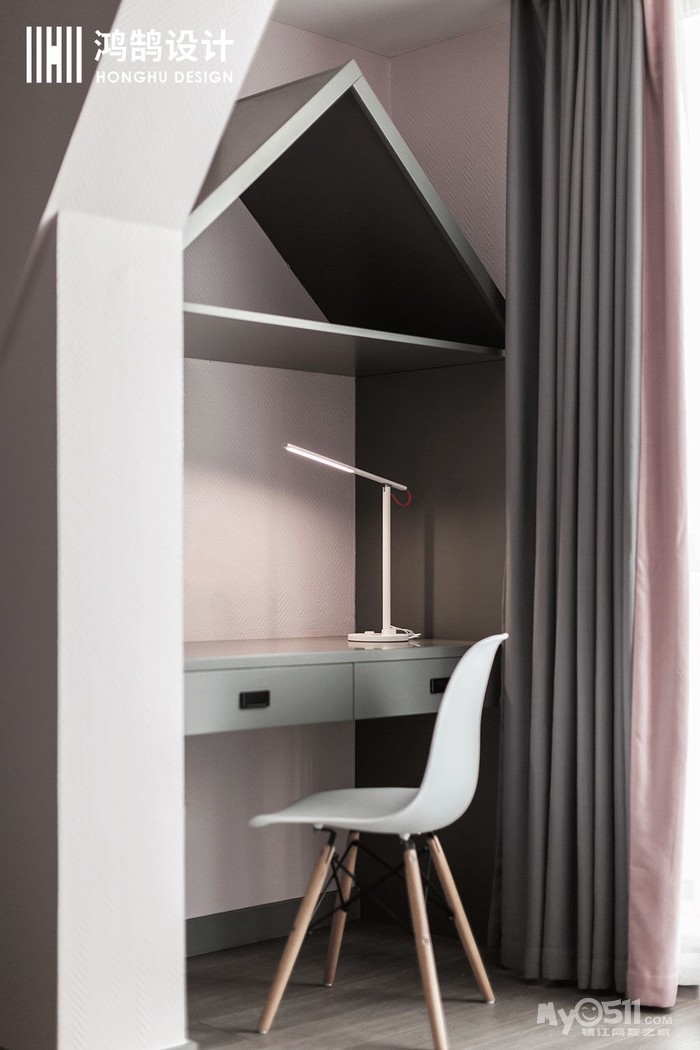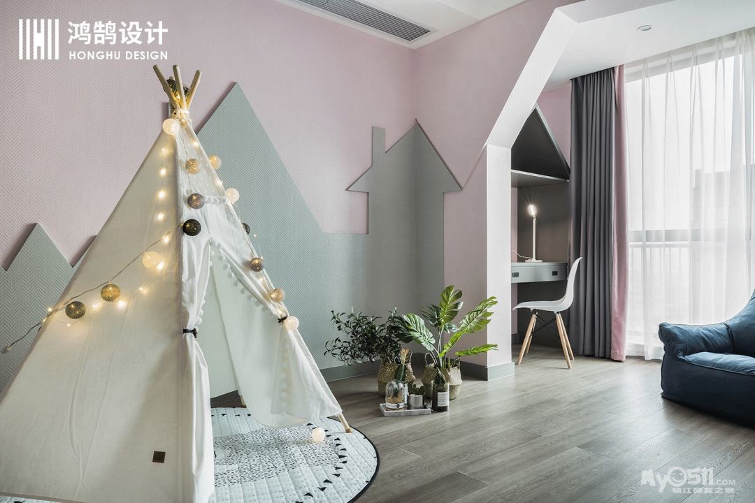 儿童房把原本的阳台和卧室打通,原本的阳台做为学习区,整体的风格为北欧ins风,采用灰粉的颜色搭配,利用房子草地这样一种概念做出来比较有趣的造型。空间看起来更连贯流畅也有主题性。