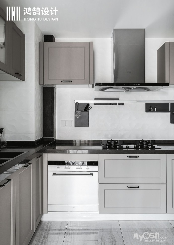 厨房以低饱和度的灰白空间为主,在功能上做了更好的细分。中西厨房的出具都是以简单、和减少空间的嵌入式来放置增加更多的橱柜,一方面可以将很多突出在外的线条做一个规整,也让置物功能变强,设计师别出心裁的设置了小吧台,在就餐人数较少时使用,减少了收拾的工作量,也能让就餐氛围不会显得冷清。