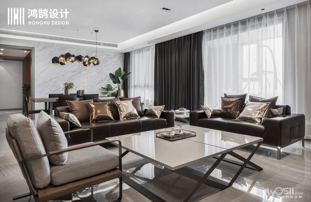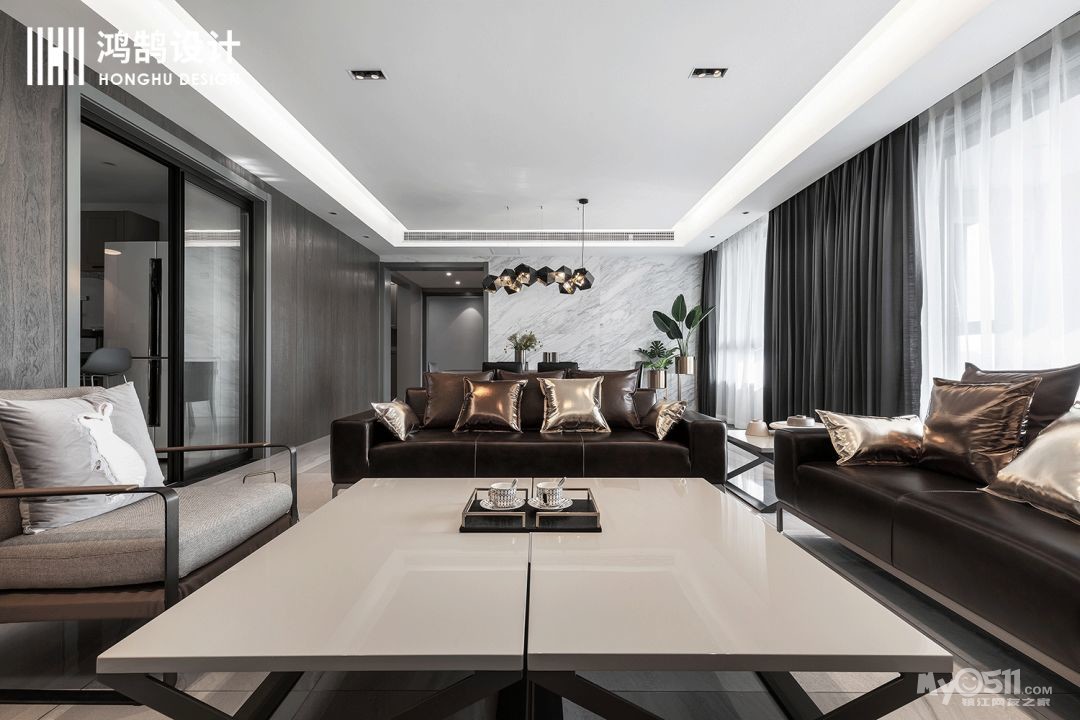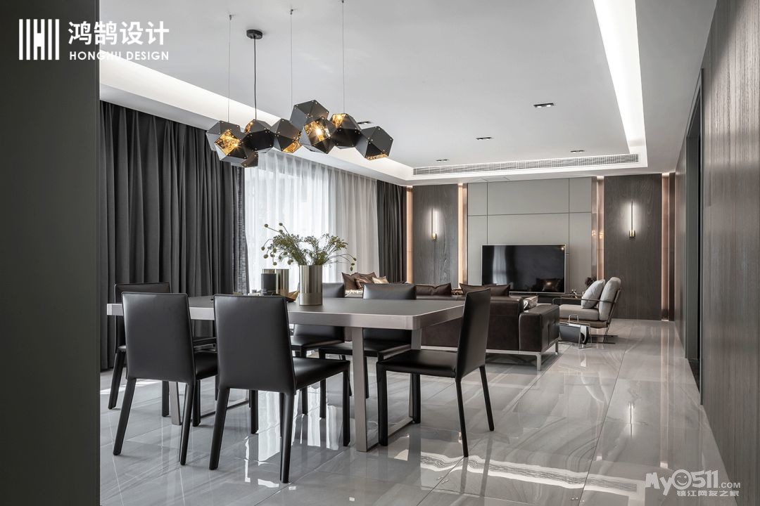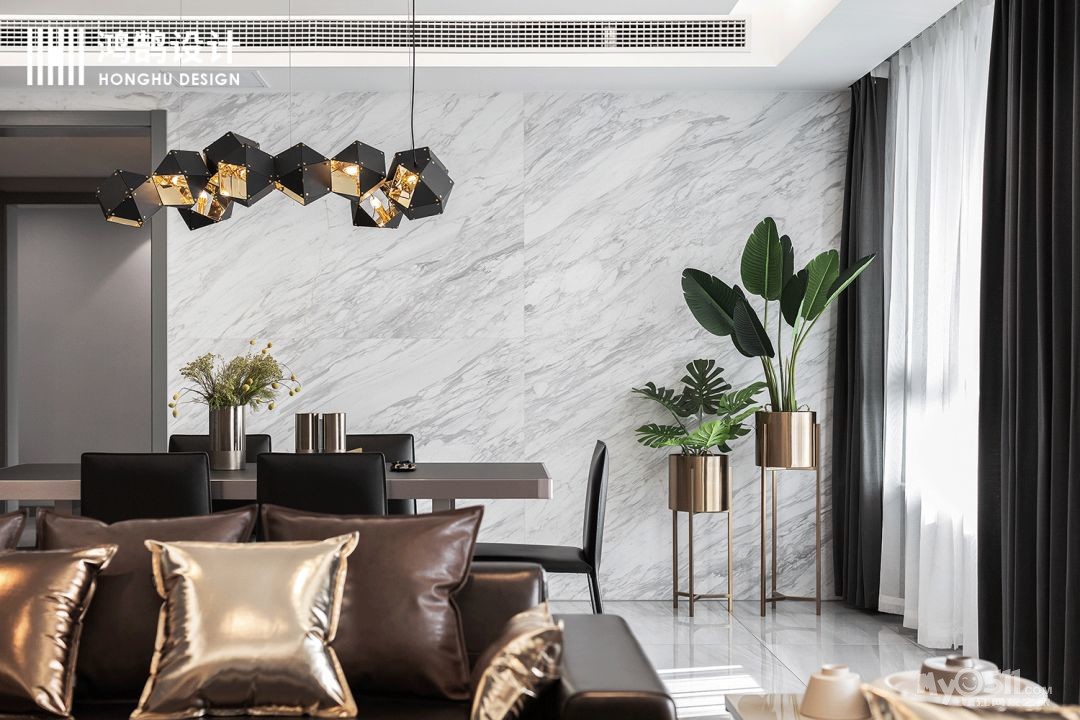 客餐厅为一个通长的空间采用中轴对称的布局方式,让空间显得更加的开阔,用材上采用了木材、金属、皮质三种材质的穿插,表达现代轻奢的质感跟层次。