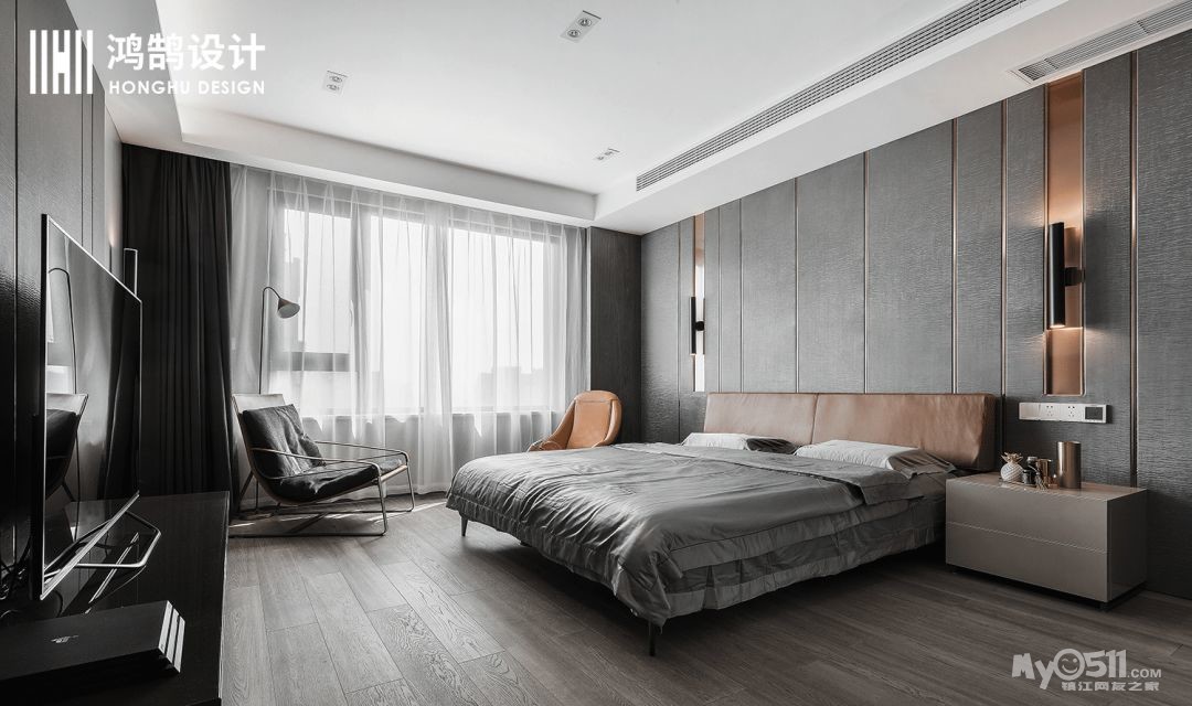 主卧室是一个通长的比较开阔的卧室跟书房空间,在就寝区我采用三边围合的床背景来划分区域让人有安全感,用材上采用了深色硬包增加卧室的神秘感,用金色的金属点缀提升空间层次和质感。