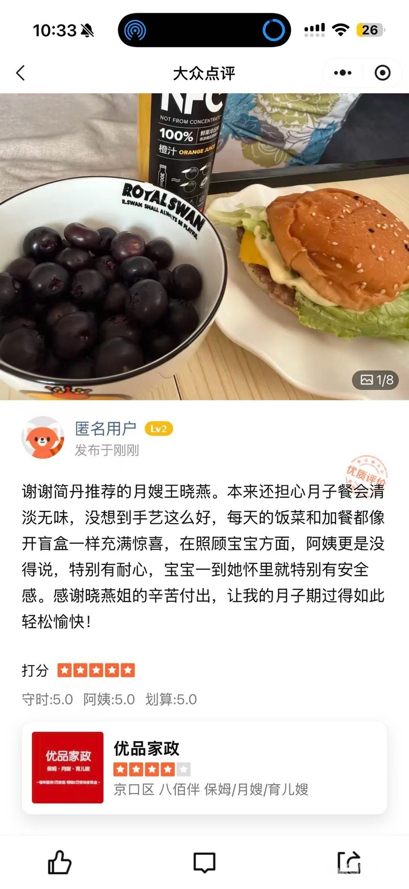 强,容易沟通,好相处,可以通过对宝妈的体质,合理搭配营养餐,也可以通过专业技能为宝妈做开奶,乳腺疏通,减轻大涨奶的痛苦,在宝宝护理方面,通过观察宝宝情绪,体质变化,做出相对措施,(如:热疹、湿疹、黄疸等)通过对宝宝的体温,睡眠,饮食及二便的观察,做到心中有数,及时提醒,精心护理,特别喜欢小宝宝,热爱母婴护理这个职业。愿我每一次贴心的服务能让宝宝健康成长,让宝妈度过一个愉快的月子,得到客户的认可!,性格温柔,素质高,人品好,性格开朗,干净利索