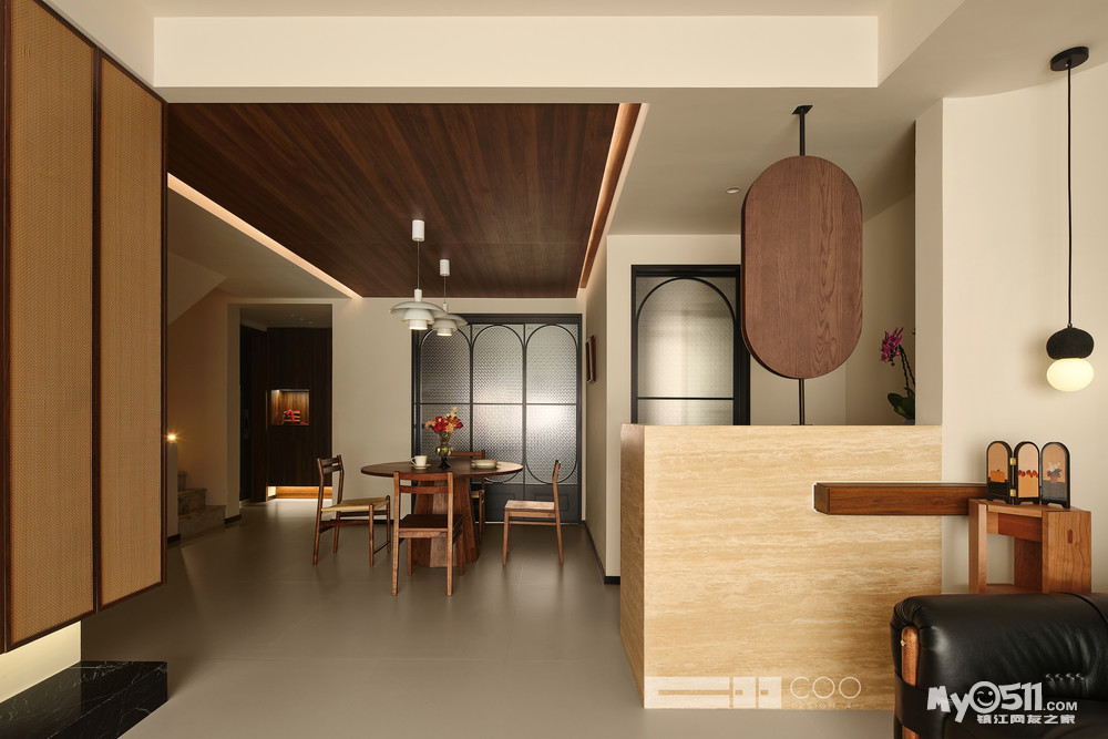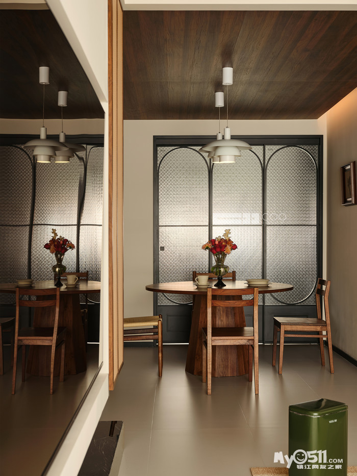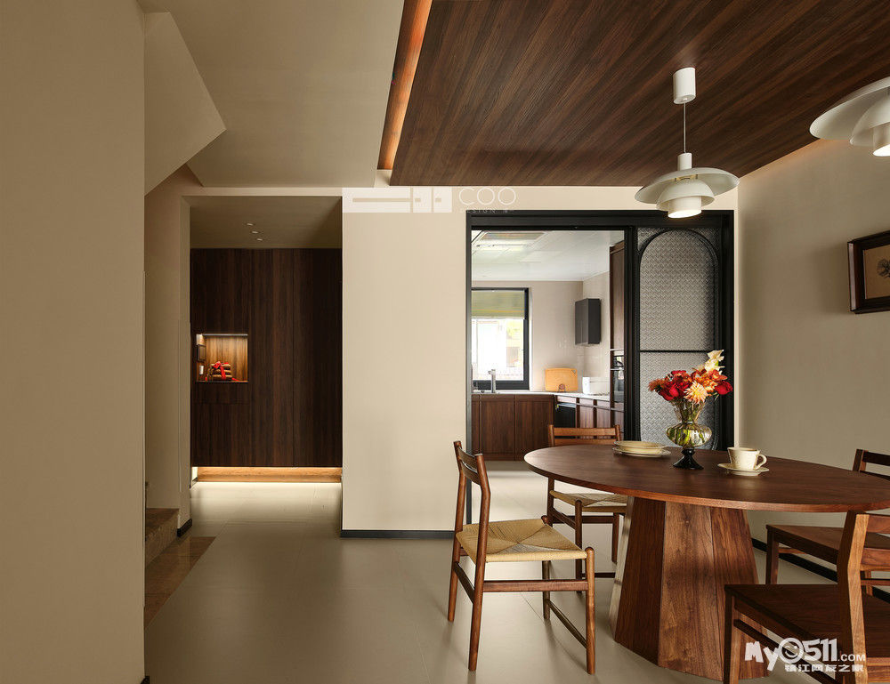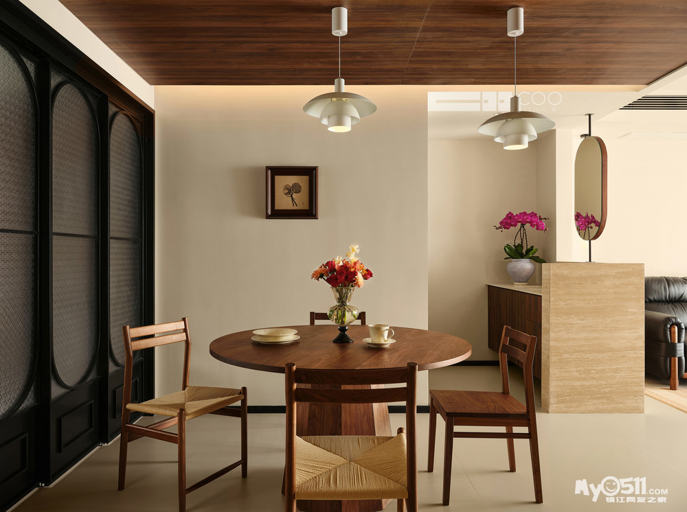 温润的胡桃木吊顶先声夺人,与圆形餐桌形成完美呼应。复古吊灯垂落而下,暖光漫过剔透的玻璃花瓶,将鲜花的层次晕染得刚刚好。