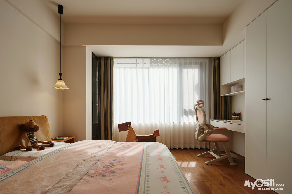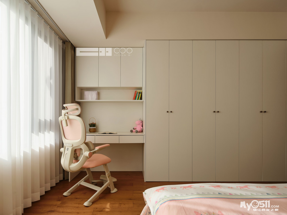 整墙的纯白柜体藏起杂乱,只留一方书桌与粉色工学椅,让孩子在阳光下写写画画。