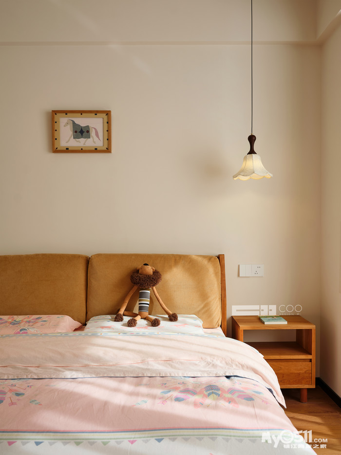 浅粉色的床品跳跃着童趣,与焦糖色的绒面床头形成温柔碰撞,一盏花瓣吊灯垂下暖光,把毛绒玩偶的影子揉得软乎乎的。
