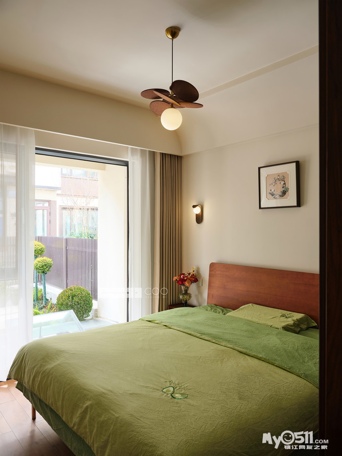 老人房橄榄绿的床品像一片被阳光晒暖的草地,与原木床头、木质吊灯组成松弛的自然叙事。落地窗外,庭院的绿意与微风漫入房间,都市的一切喧嚣都被隔绝在外。