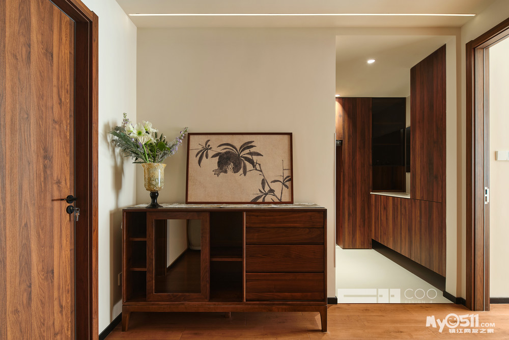 一束花、一幅画,随意置于实木边柜上,与米白墙面形成温柔的视觉缓冲,家的松弛感就此体现。
