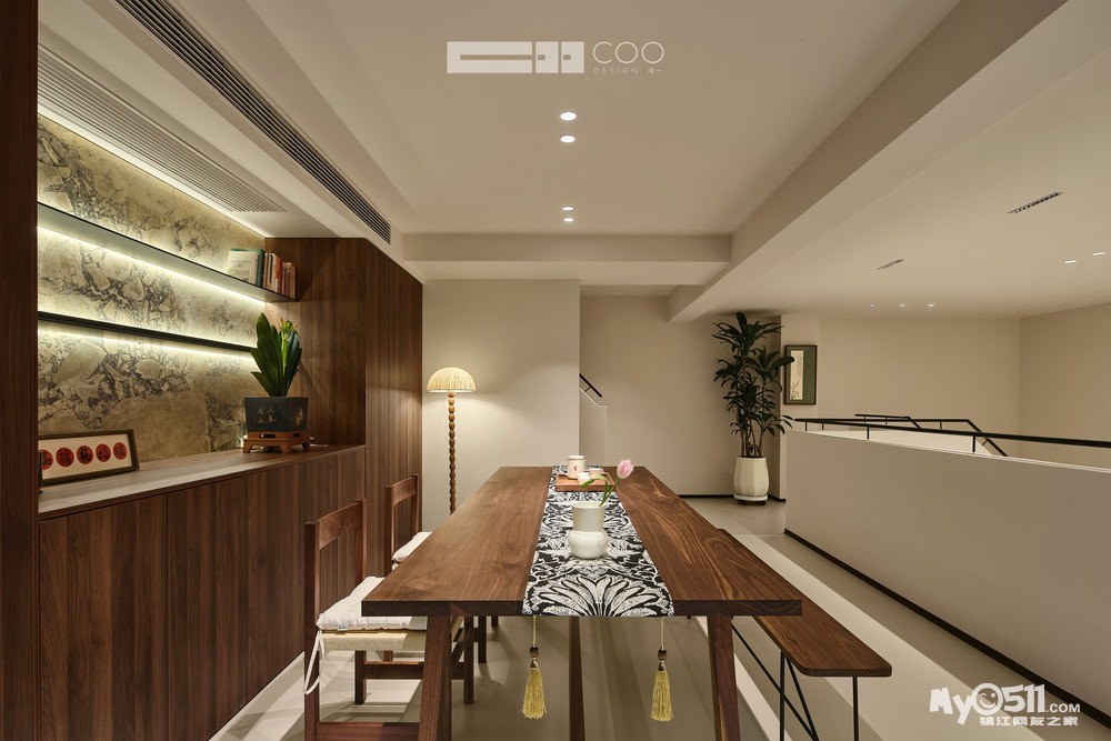 长桌铺着黑白花纹的茶席,流苏轻垂,与原木的温润形成雅致的对话。一盏落地灯晕开暖黄的光,为空间晕染出松弛的底色。在明暗交错里,茶烟与光影一同舒展。